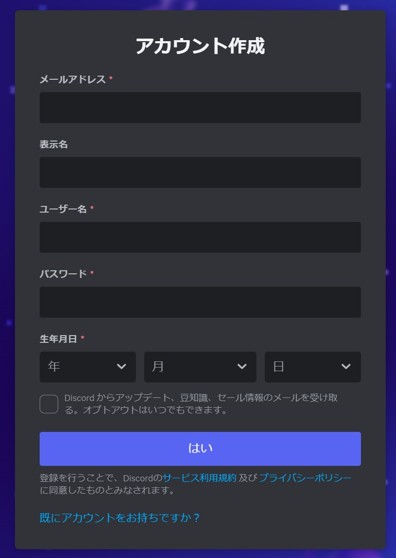 アプリを起動するとログイン画面がでてきます。Discordアカウントをお持ちの方はログインください。アカウントをお持ちでない方は、「アカウントの作成」を選択いただき