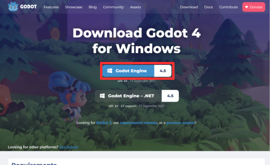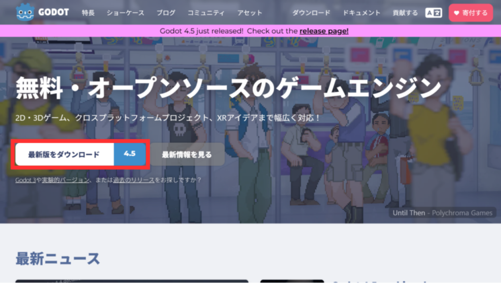 Godotの公式サイト(🔗https://godotengine.org)にアクセスし、最新版をダウンロードをクリックします。